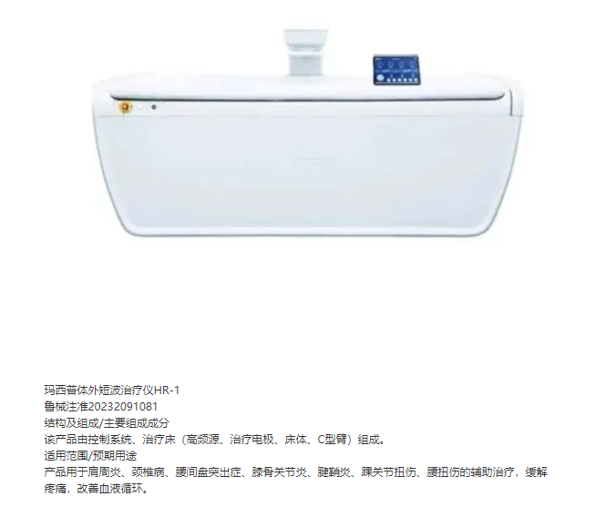 瑪西普體外短波治療儀HR-1魯械注準(zhǔn)20232091081結(jié)構(gòu)及組成/主要組成成分該產(chǎn)品由控制系統(tǒng)、治療床(高頻源、治療電極、床體、C型臂)組成。適用范圍/預(yù)期用途產(chǎn)品用于肩周炎、頸椎病、腰間盤突出癥、膝骨關(guān)節(jié)炎、腱鞘炎、踝關(guān)節(jié)扭傷、腰扭傷的輔助治療,緩解疼痛,改善血液循環(huán)。
