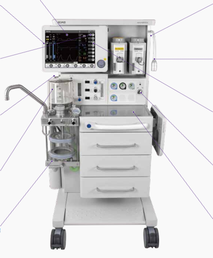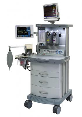 麻醉最普遍的呼吸回路都是“循環(huán)系統(tǒng)”。兩個單向活瓣使氣體流入由化學(xué)方法吸收二氧化碳的循環(huán)回路中去。在此系統(tǒng)中,來自麻醉機(jī)的新鮮氣體在二氧化碳吸收罐的下游部位和吸氣單向活瓣的上游部位進(jìn)入呼吸回路。進(jìn)來的新鮮氣體與回路系統(tǒng)內(nèi)原有的氣體混合,流過吸氣單向活瓣,并且流經(jīng)可重復(fù)使用或一次性使用的波紋管道到達(dá)Y 形管。病人呼出的氣體流過循環(huán)系統(tǒng)的另一支(呼氣),通過呼氣單向活瓣進(jìn)入儲氣囊。通過擠壓,儲氣囊中產(chǎn)生正壓,迫使已搜集的氣體通過二氧化碳吸收裝置。由于流入回路系統(tǒng)的新鮮空氣要比病人和吸收劑消耗的氣體多得多,因此就必須在呼氣單向活瓣和二氧化碳吸收罐之間安裝一個這樣保險閥。當(dāng)壓力超過規(guī)定閾值時多余氣體可以逸出。吸收罐中盛裝碳酸鈉石灰(鈉、鉀和氫氧化鈣的混合物)或盛裝氫氧化鋇石灰(氫氧化鋇、八氫水化物和氫氧化鈣的混合物)。這些物質(zhì)通過化學(xué)反應(yīng)吸收二氧化碳,同時釋放熱和水(釋放出的水可以濕潤循環(huán)系統(tǒng)中的空氣)。當(dāng)吸收能力耗盡時,指示劑就會改變顏色。吸收罐的設(shè)計必須要便于更換吸收劑。排出過多氣體用的APL 閥通常用的是一個彈簧負(fù)載閥。彈簧張力是控制回路壓力的,如果病人自發(fā)呼吸,保險閥就處于打開的位置,呼吸以最小阻力吸氣和呼出氣流。如果病人被深度麻醉以及深度麻痹,麻醉師就可以部分或全部關(guān)上保險閥,以擠壓儲氣囊使氣體充滿肺部,幫助和控制病人呼吸。從保險閥排出的廢氣應(yīng)通過排氣管引導(dǎo)到手術(shù)室外,以避免微量麻醉氣體對手術(shù)室工作人員的健康的危害。